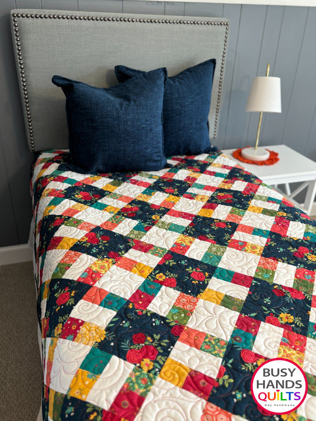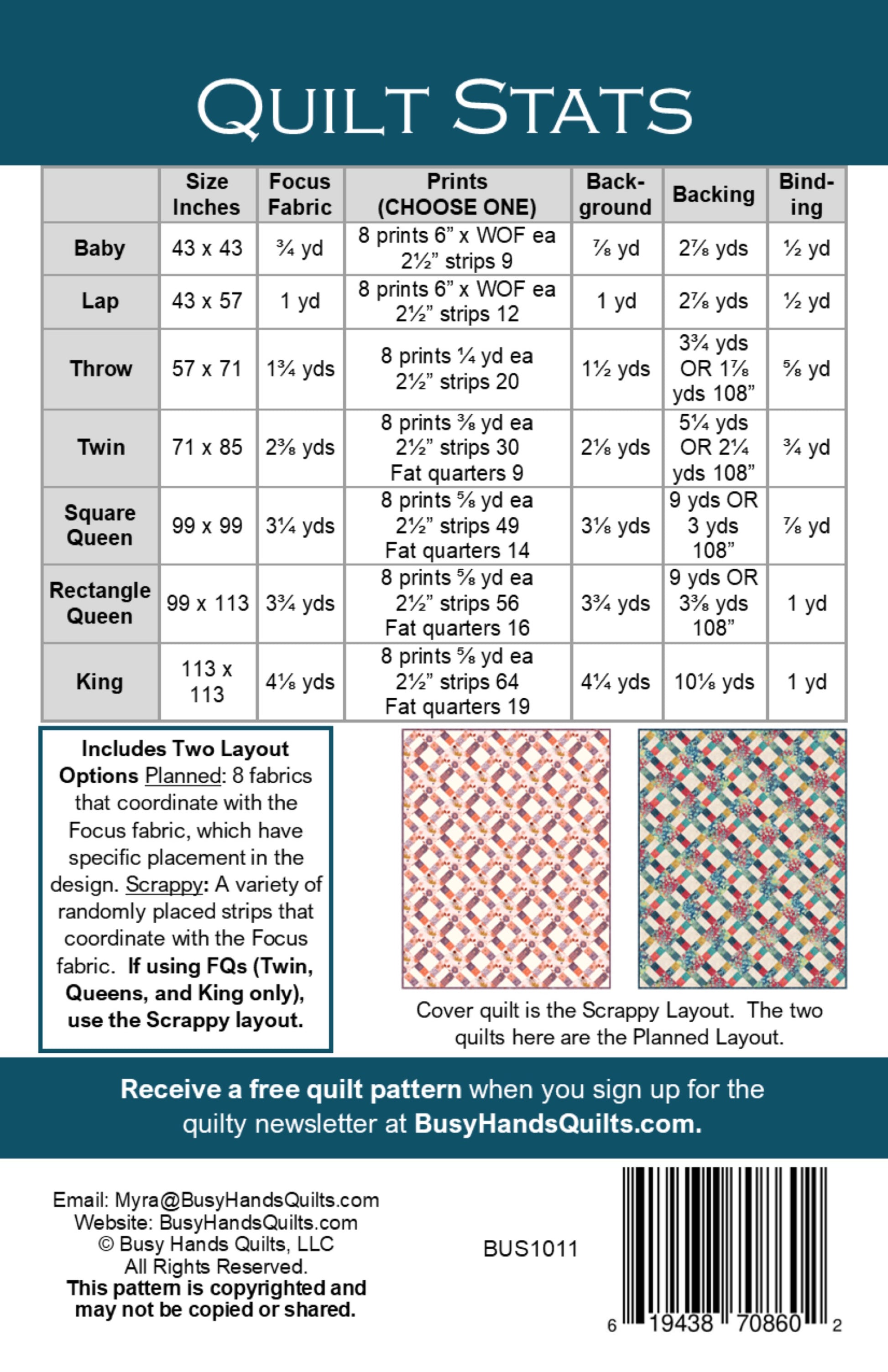 In the Bountiful quilt pattern your favorite fabric takes center stage, highlighted by coordinating fabrics to really let it shine. The pattern includes two layout options - Planned Layout with 8 fabrics that coordinate with the focus fabric and have a specific placement in the design and the Scrappy Layout which uses many fabrics placed randomly and which coordinate with the focus fabric.