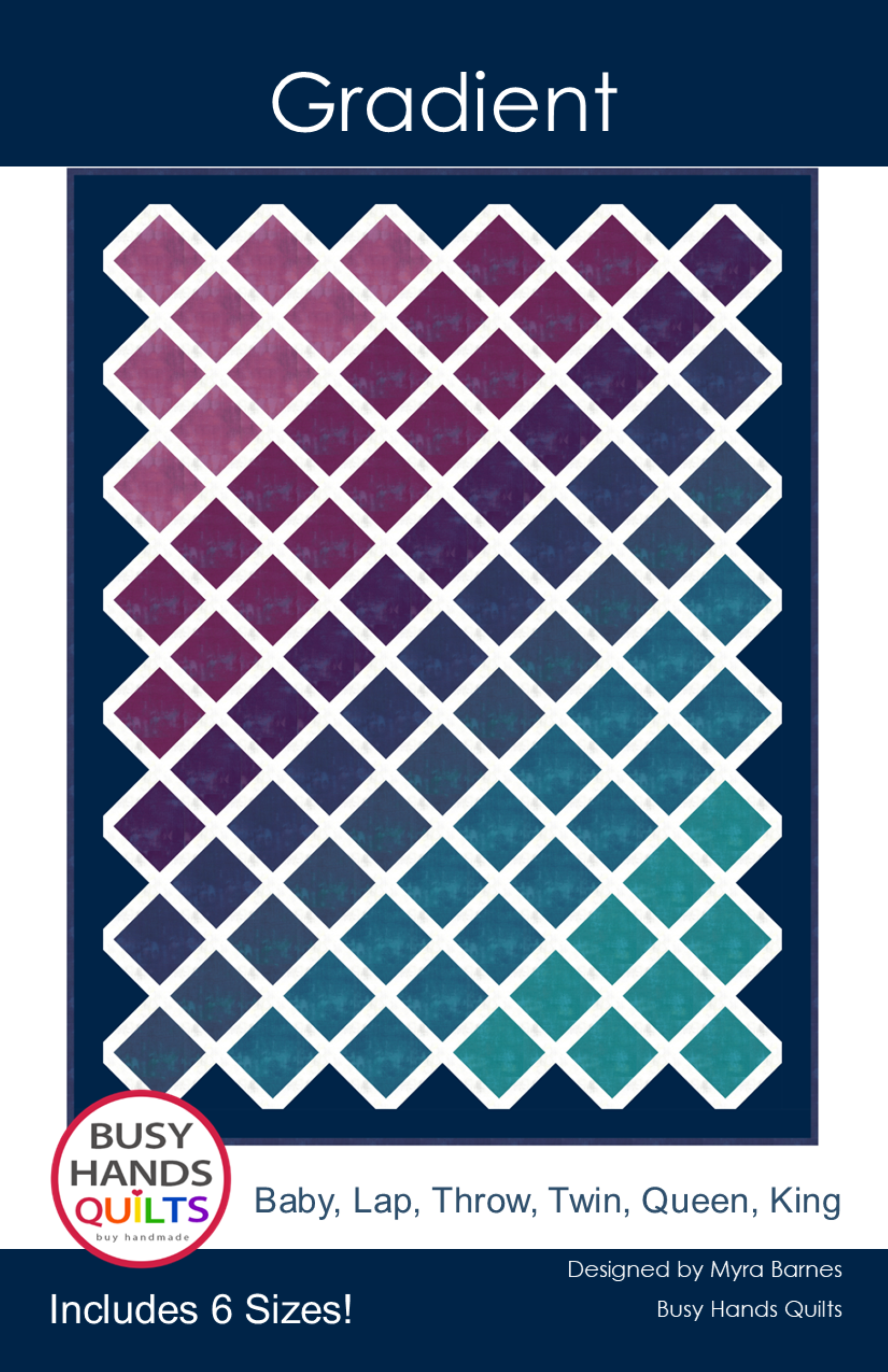 Gradient has easy-to-follow, step-by-step instructions, charts and diagrams for cutting and piecing this stunning quilt. Previous knowledge of quilt top assembly, basting, quilting, and binding are assumed and are not taught in this pattern.