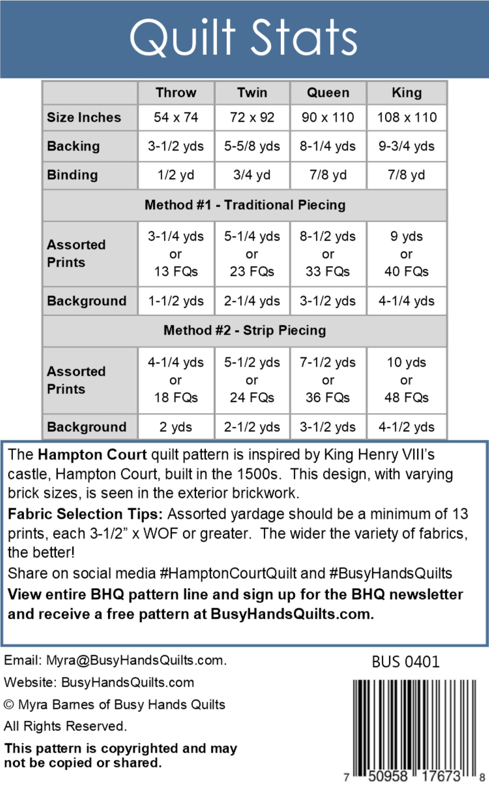 Hampton Court is suitable for intermediate quilters and up. It includes easy-to-follow, step-by-step instructions, charts, and diagrams for cutting and piecing this stunning quilt. Previous knowledge of quilt top assembly, basting, quilting, and binding are assumed and are not taught in this pattern.