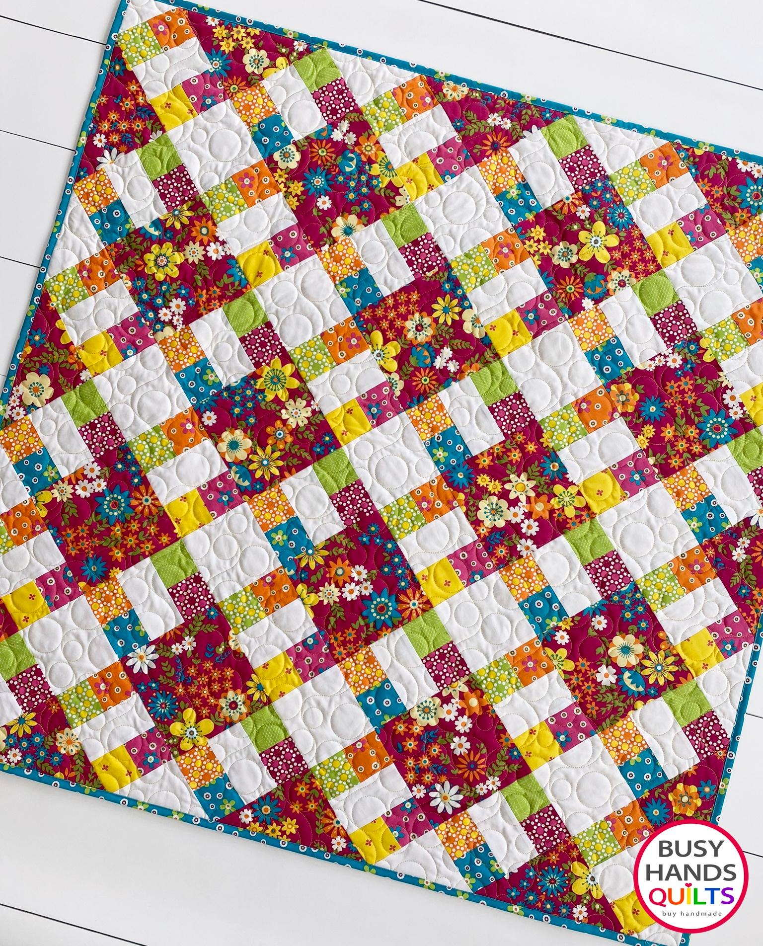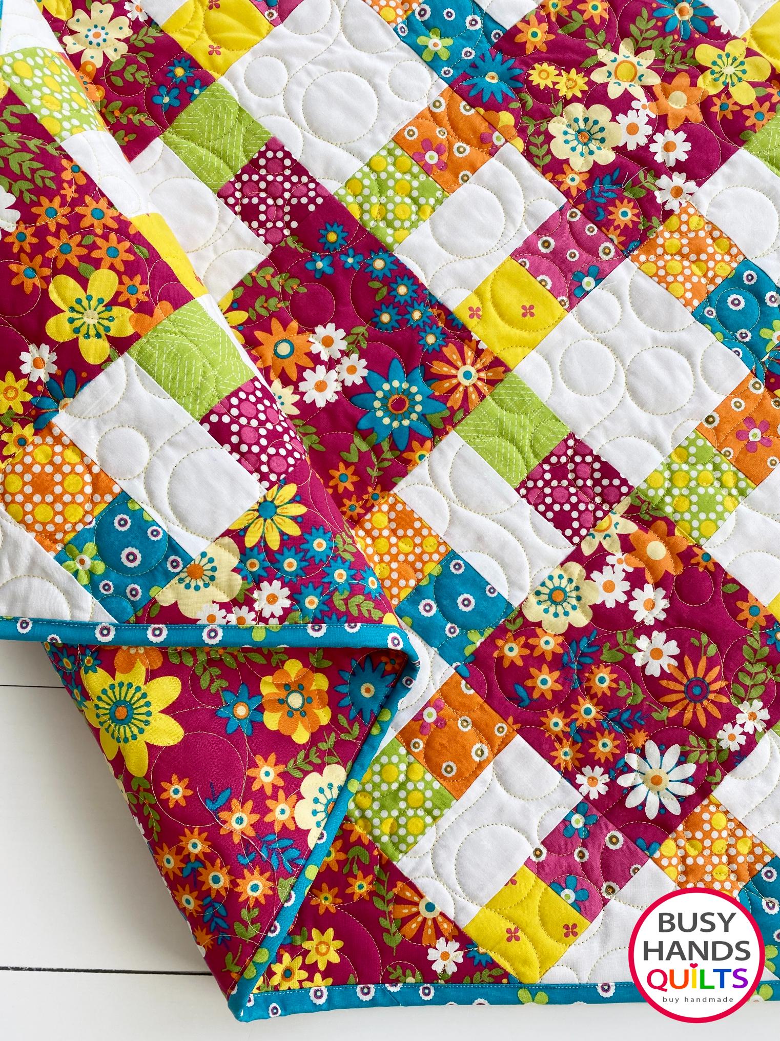 Fabrics are all quilt-shop quality fabrics from the Mini Fab fabric collection by Boundless on a background of crisp Kona Cotton White. The prints are bright and happy magenta, teals, yellow, and orange. Batting is Hobbs Heirloom 80/20 cotton/poly, and the quilting design is stunning circle bubbles design in yellow thread that complements the quilt. The quilt lies flat with straight edges and square corners. The backing fabric is a magenta floral print which is also found in the quilt front. Binding is a teal print from the collection, double fold and attached by machine for durability.