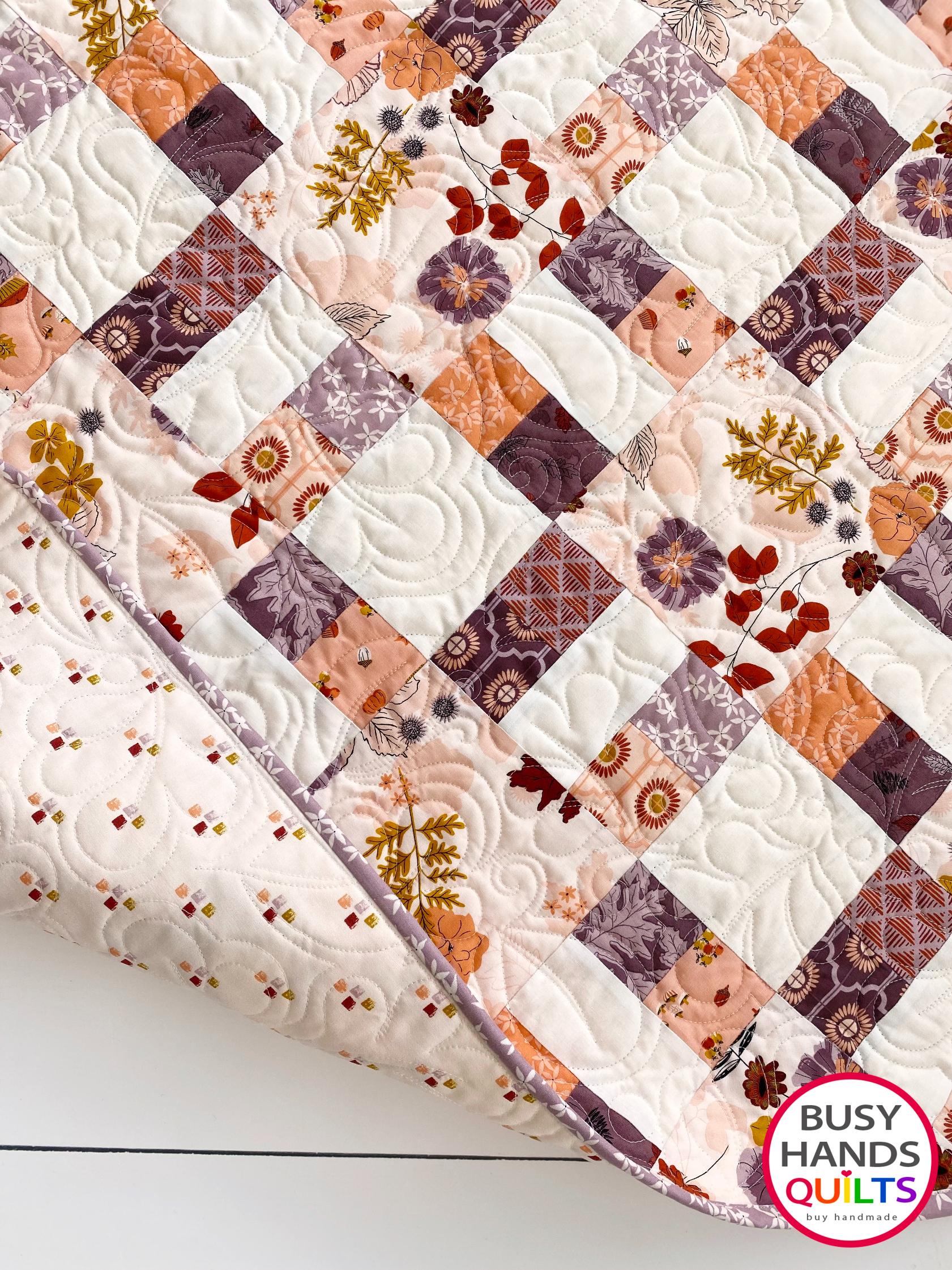 Fabrics are all quilt-shop quality fabrics from the Maple fabric collection by Gabrielle Neil for Riley Blake Designs on a background of Confetti Cotton Cloud. Batting is Hobbs Heirloom 80/20 cotton/poly, and the quilting design is a stunning feathered leaves design in creamy white thread that complements the quilt. The quilt lies flat with straight edges and square corners. The backing fabric is a coordinating fabric from the Maple collection. Binding is a purple print from the collection, double fold and attached by machine for durability.