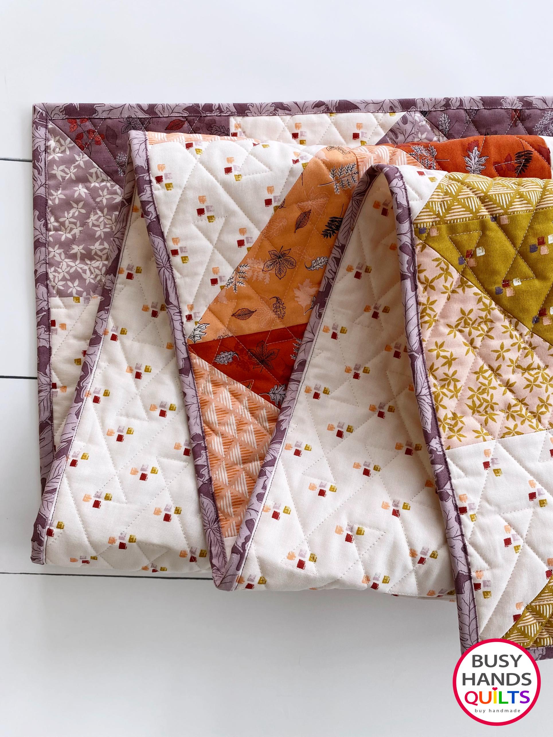 Fabrics are all quilt-shop quality fabrics from the Maple fabric collection by Riley Blake Designs, including the background print. Batting is Hobbs Heirloom 80/20 cotton/poly, and the quilting design is stunning triangle diamond design in cream thread that complements the quilt. The quilt lies flat with straight edges and square corners. The backing fabric is a light pink print from the collection, continuing with the theme on the front.