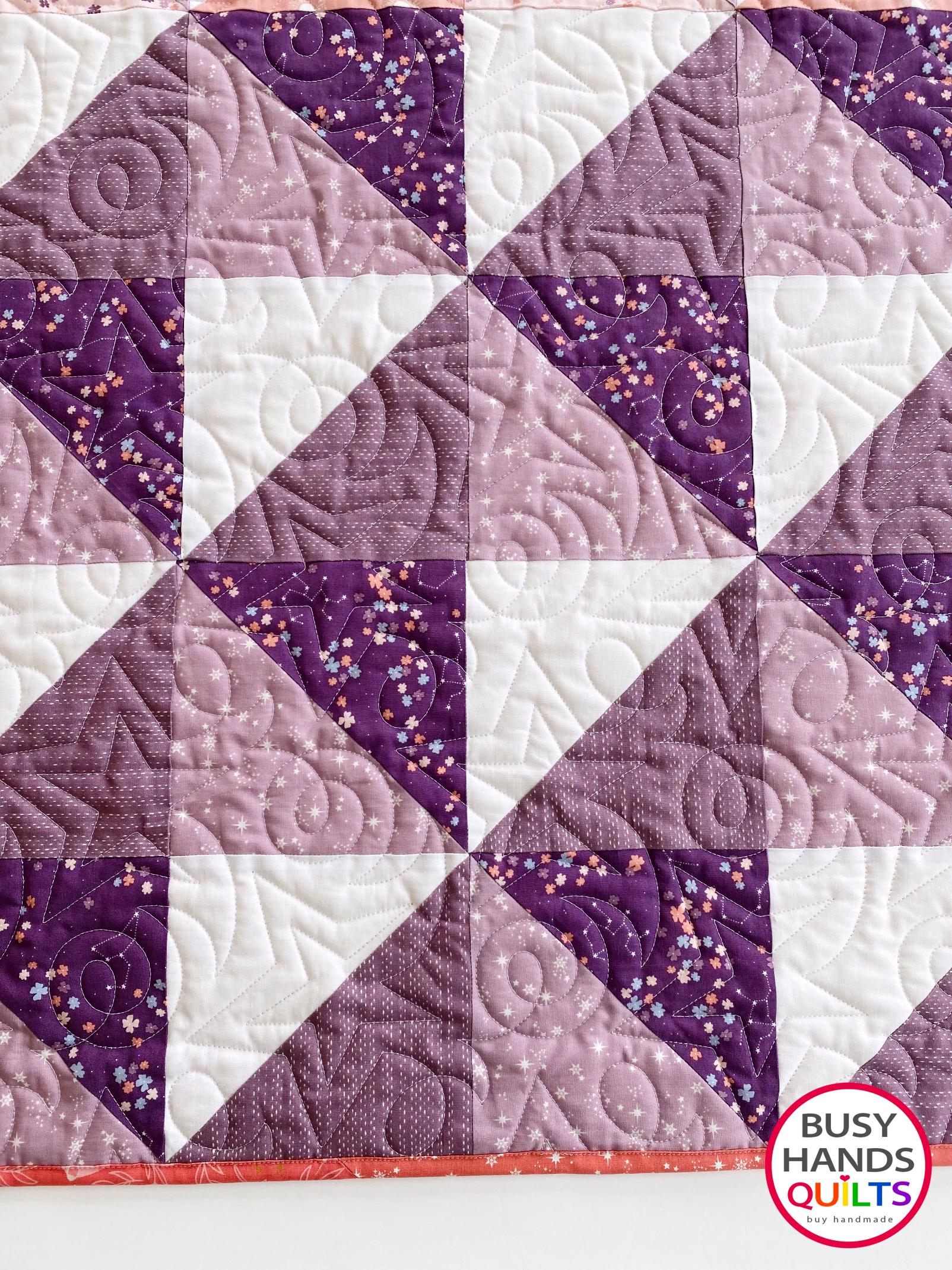 Fabrics are all quilt-shop quality fabrics from the Moonchild fabric collection by Fran Gulick for Riley Blake Designs on a background of Kona Cotton Solid White. Batting is Hobbs Heirloom 80/20 cotton/poly, and the quilting design is stunning star and loop design in white thread that complements the quilt. The quilt lies flat with straight edges and square corners. The backing fabric is a peachy gingham print from Riley Blake Designs, continuing with the theme on the front.