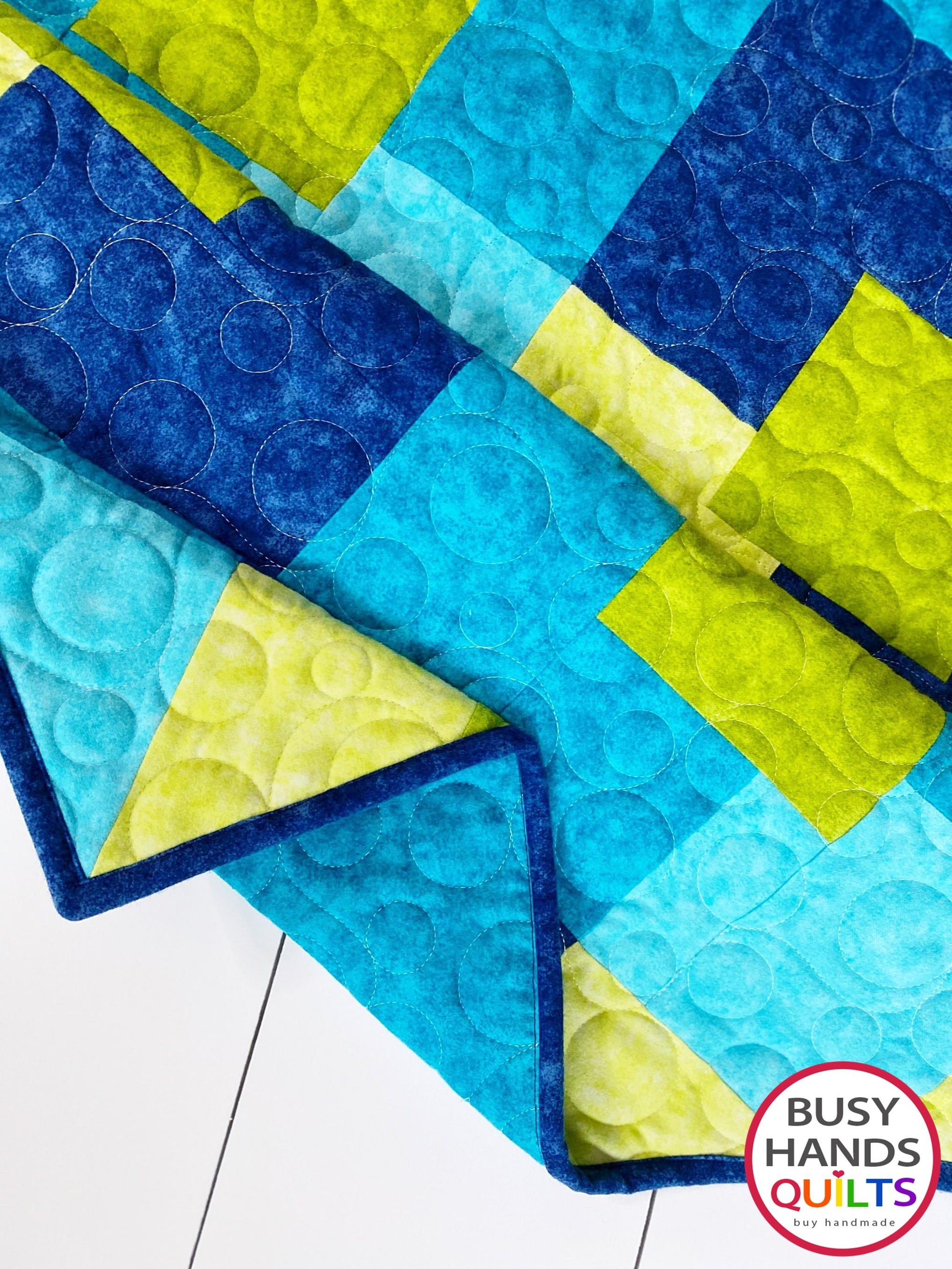 Fabrics are all quilt-shop quality fabrics from the Mirage Flannel fabric collection by Connecting Threads. Batting is Hobbs Heirloom 80/20 cotton/poly, and the quilting design is a stunning bubble design in white thread that complements the quilt. The backing fabric is a turquoise fabric from the Mirage flannel collection. Binding is a blue print from the collection, double fold and attached by machine for durability.