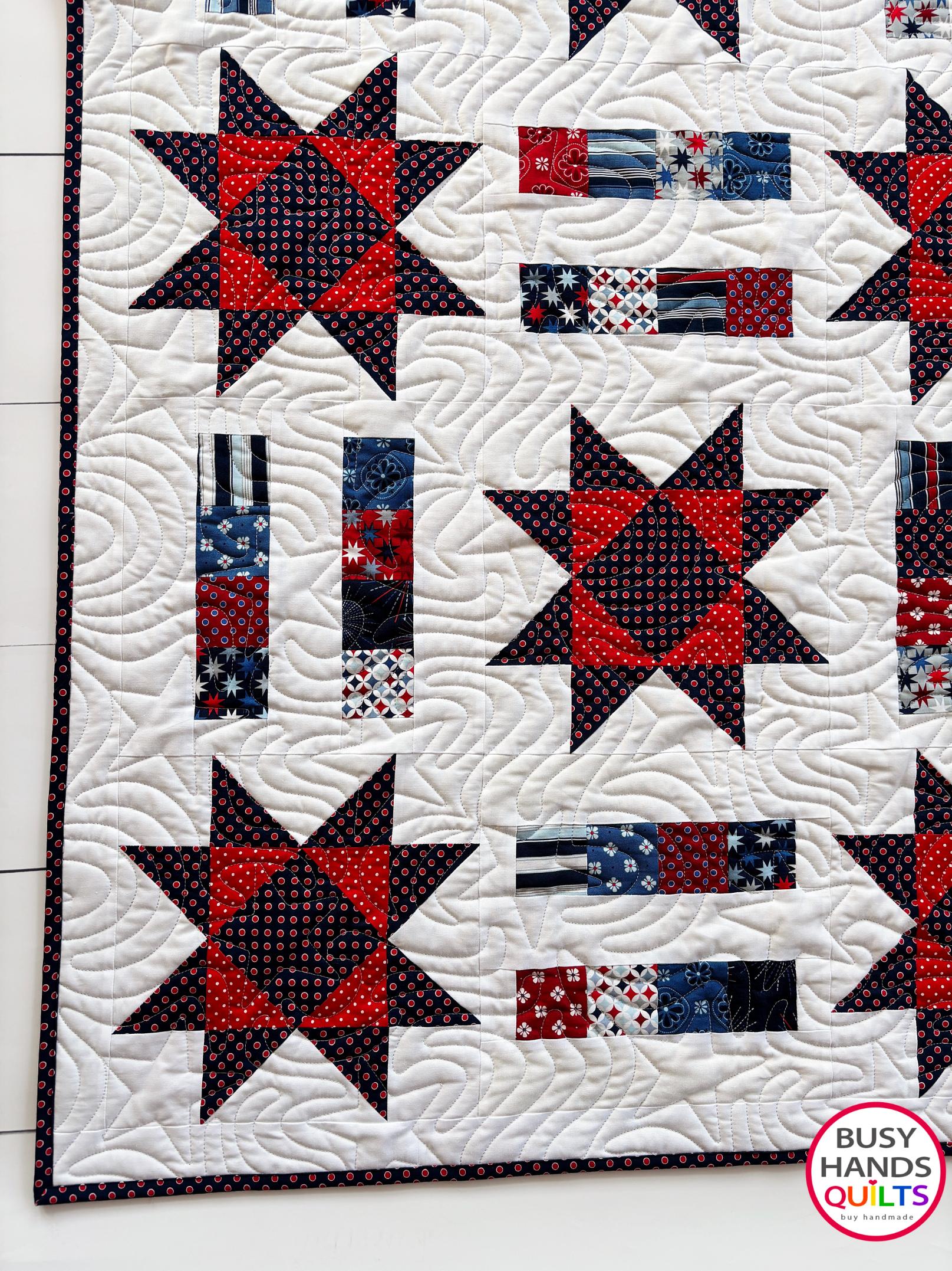 Fabrics are all quilt-shop quality fabrics from the Picadilly fabric collection by Riley Blake Designs. Batting is Hobbs Heirloom 80/20 cotton/poly, and the quilting is a stunning stars and stripes design in white thread that complements the quilt. The quilt lies flat with straight edges and square corners. The back of this quilt is a red/white dots on a navy blue background, continuing with the patriotic theme on the front.