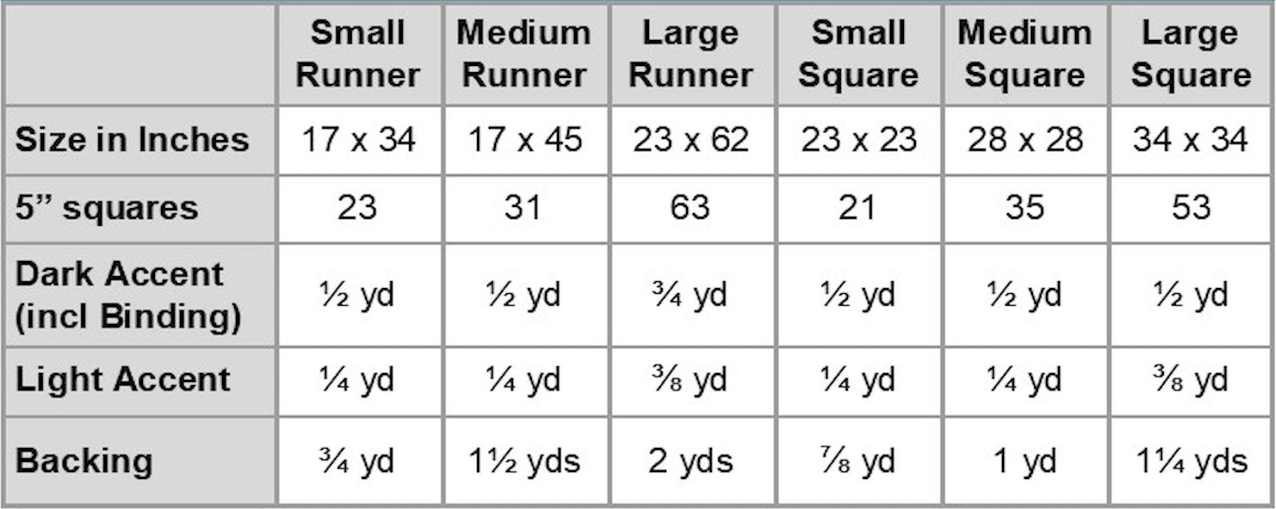 - Includes 6 sizes - Small, Medium, and Large Runners; and Small, Medium, and Large Square quilts