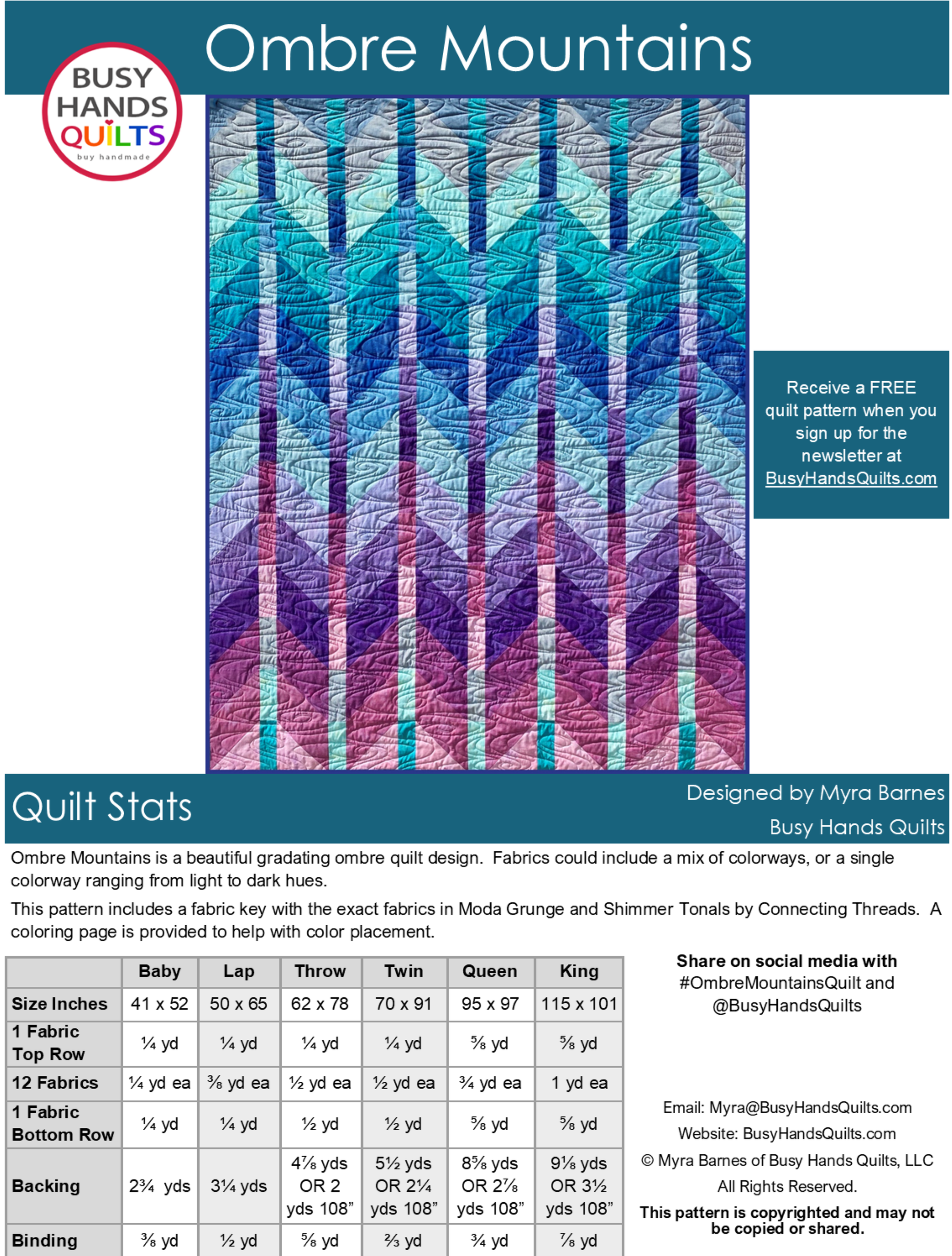 Ombre Mountains is a beautiful gradating ombre quilt design that includes 6 sizes - Baby, Lap, Throw, Twin, Queen, and King.