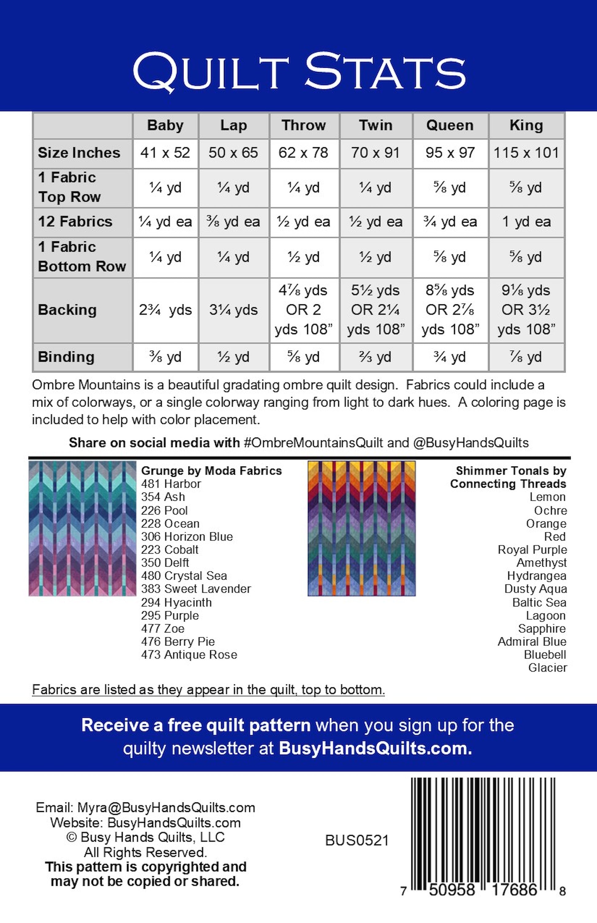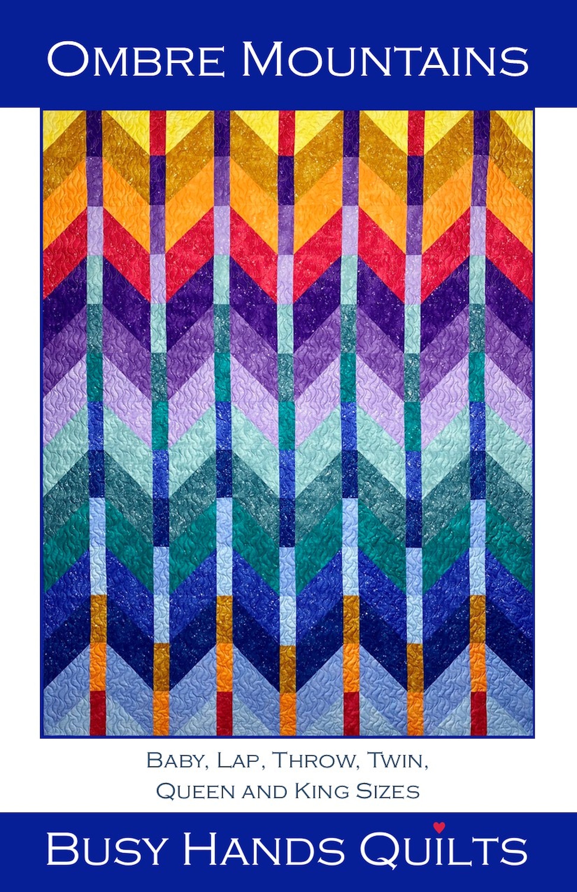 Ombre Mountains is suitable for confident beginners and up. It has easy-to-follow, step-by-step instructions, charts and diagrams for cutting and piecing this stunning quilt. Previous knowledge of quilt top assembly, basting, quilting, and binding are assumed and are not taught in this pattern.