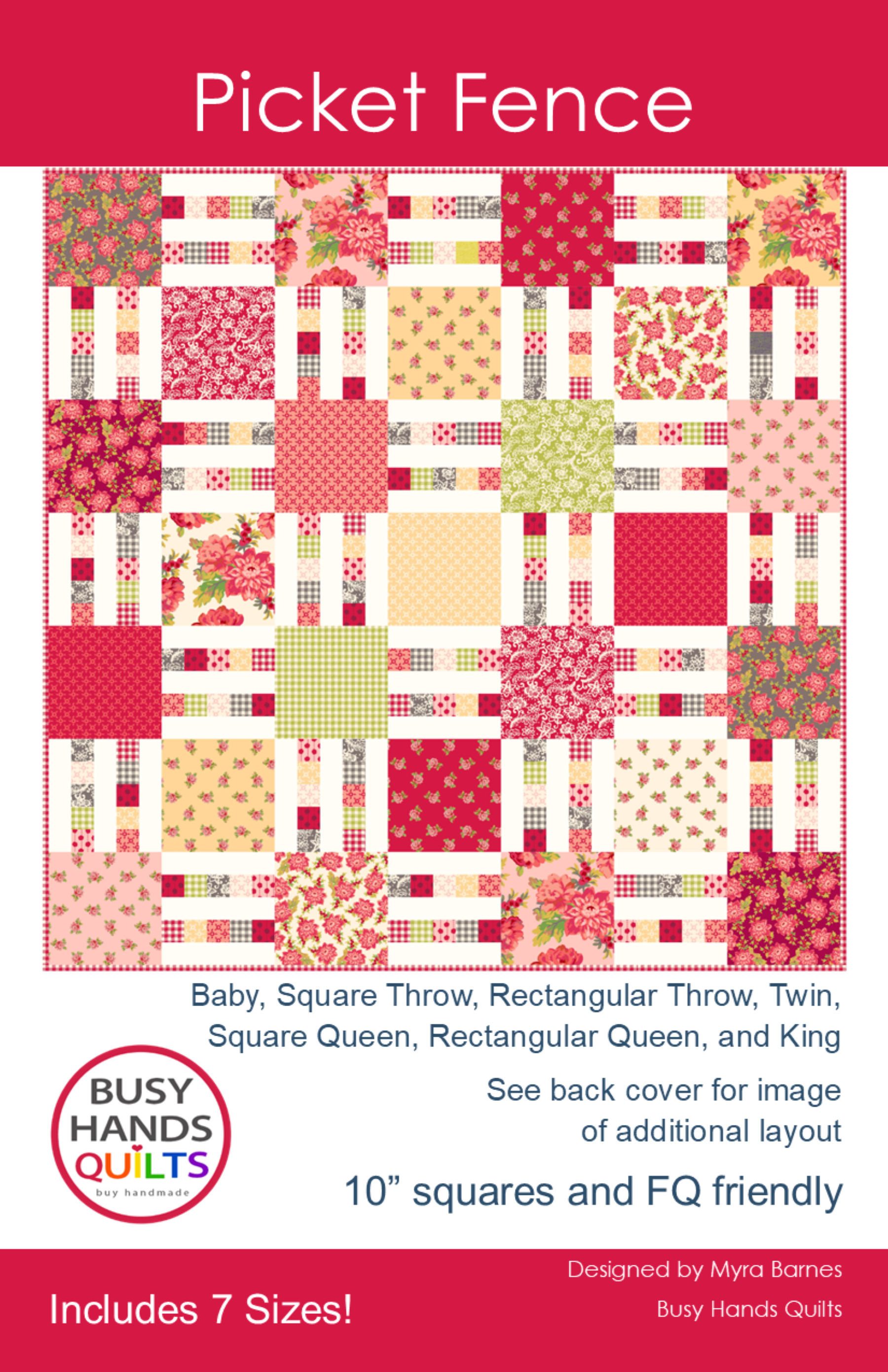 The Picket Fence quilt pattern includes seven sizes and includes instructions for using 10" layer cake squares, fat quarters, or a combination of 10" squares and strips. Strip piecing speeds up the process. Sometimes you want a square Throw, other times you may want to make a rectangular Throw; or a square Queen might fit your desired size better than a rectangular Queen. You will find both square and rectangular Throws, as well as square and rectangular Queen quilts in this pattern. The blocks can be oriented different directions to change the look of the quilt; it's all included in the pattern.