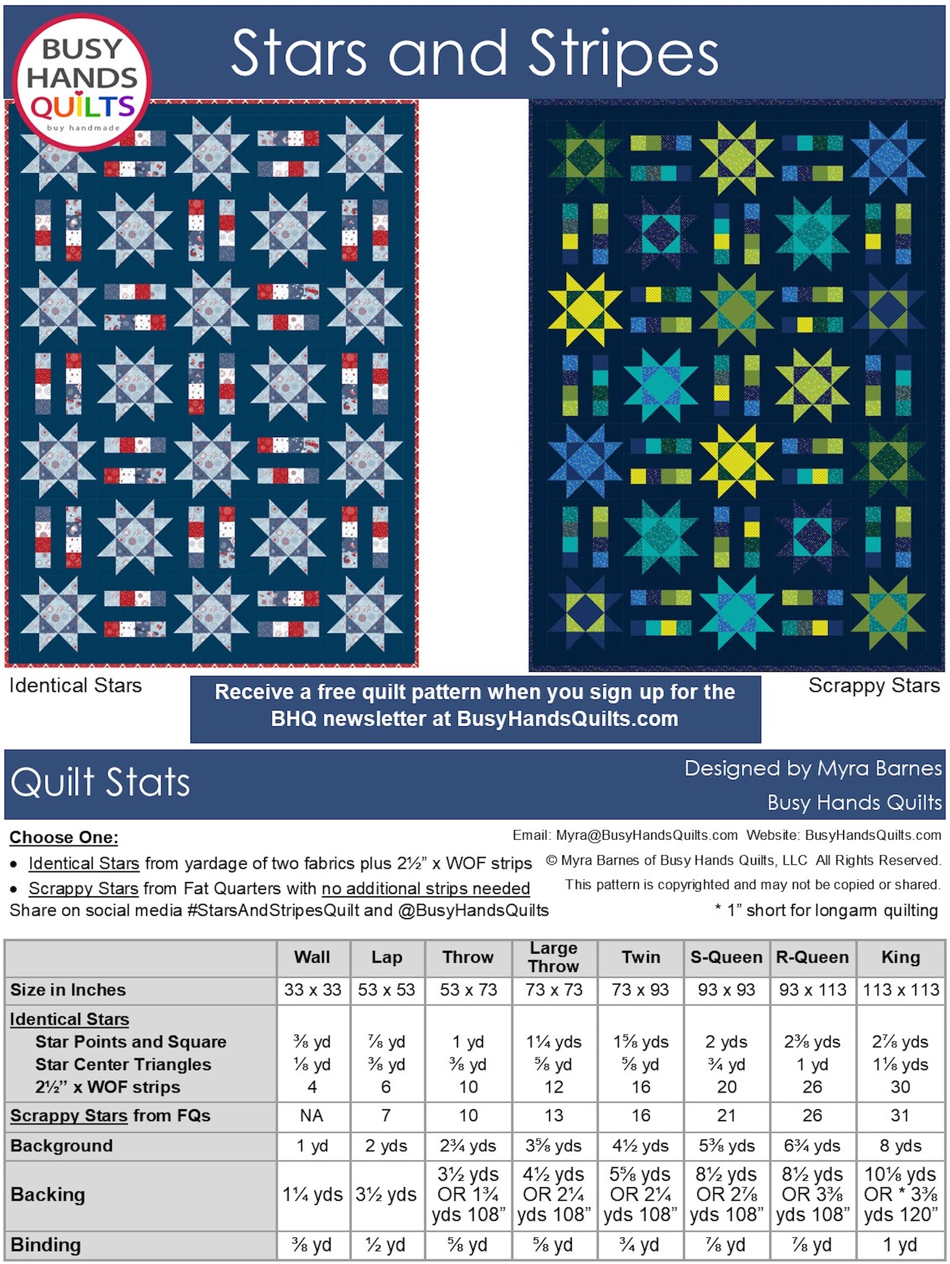 The Stars and Stripes quilt pattern combines sparkling stars with pieced stripe blocks for a show-stopping design. Includes all of the quilt sizes, two star options, and utilizes strip piecing.