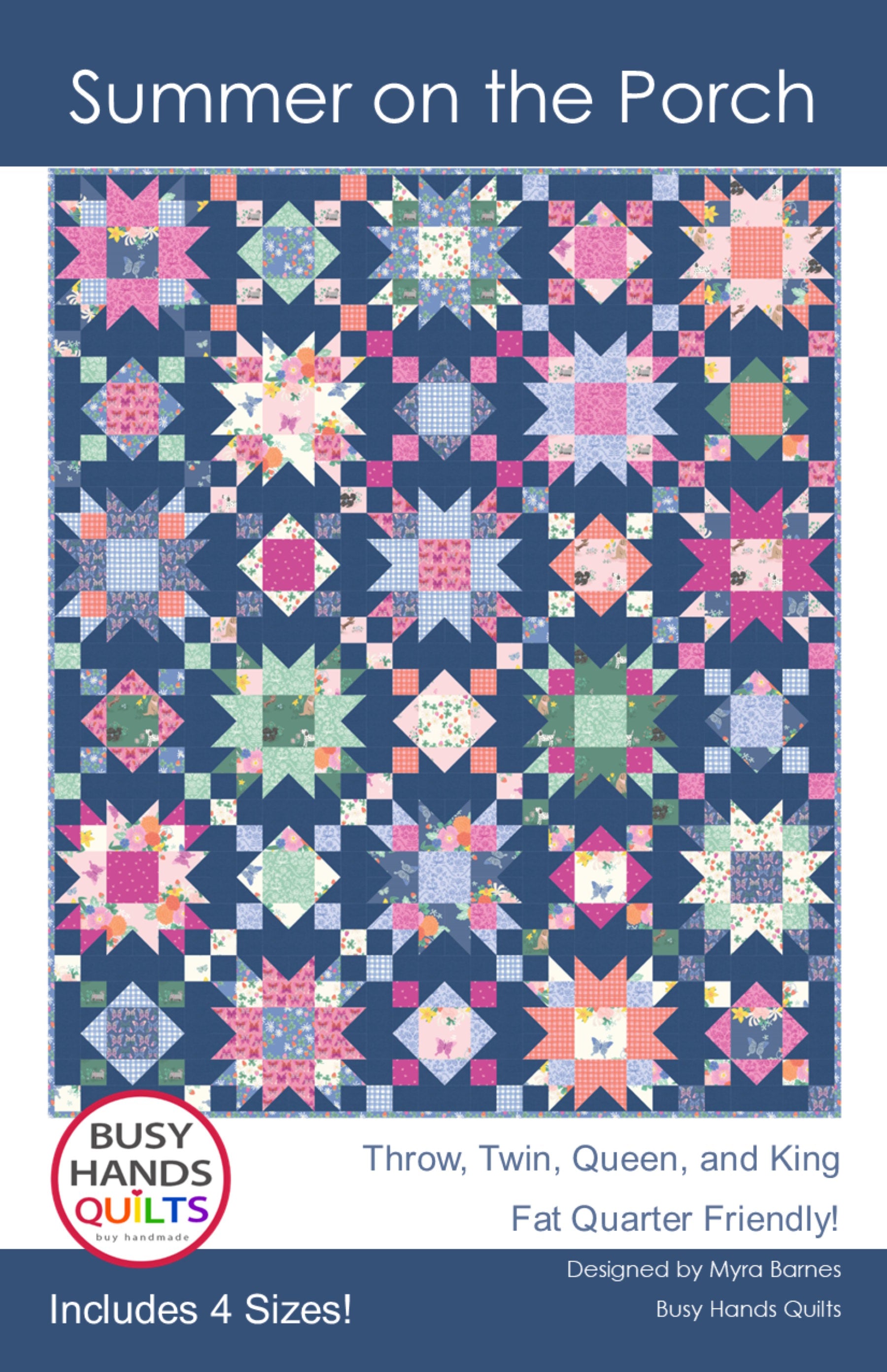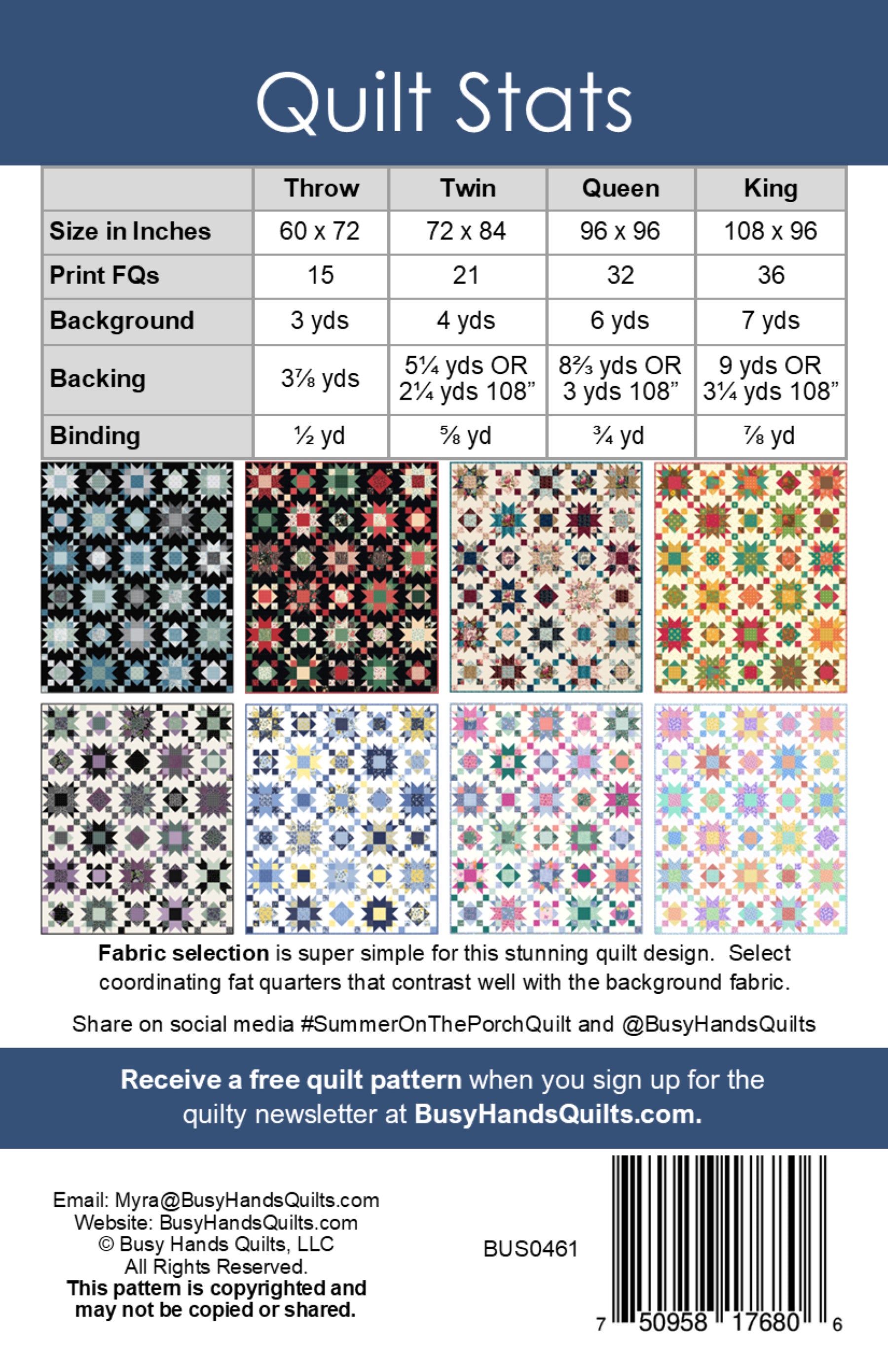 Summer on the Porch is an eye-catching, heart-warming pattern that you'll turn to again and again because of its timeless beauty. You'll love the star blocks mixed with chain blocks. This pattern looks fantastic in any fabric combination, including today's modern fabrics, as well as reproduction, primitive, and odd, hard-to-use fabrics. Anything goes with this pattern.
