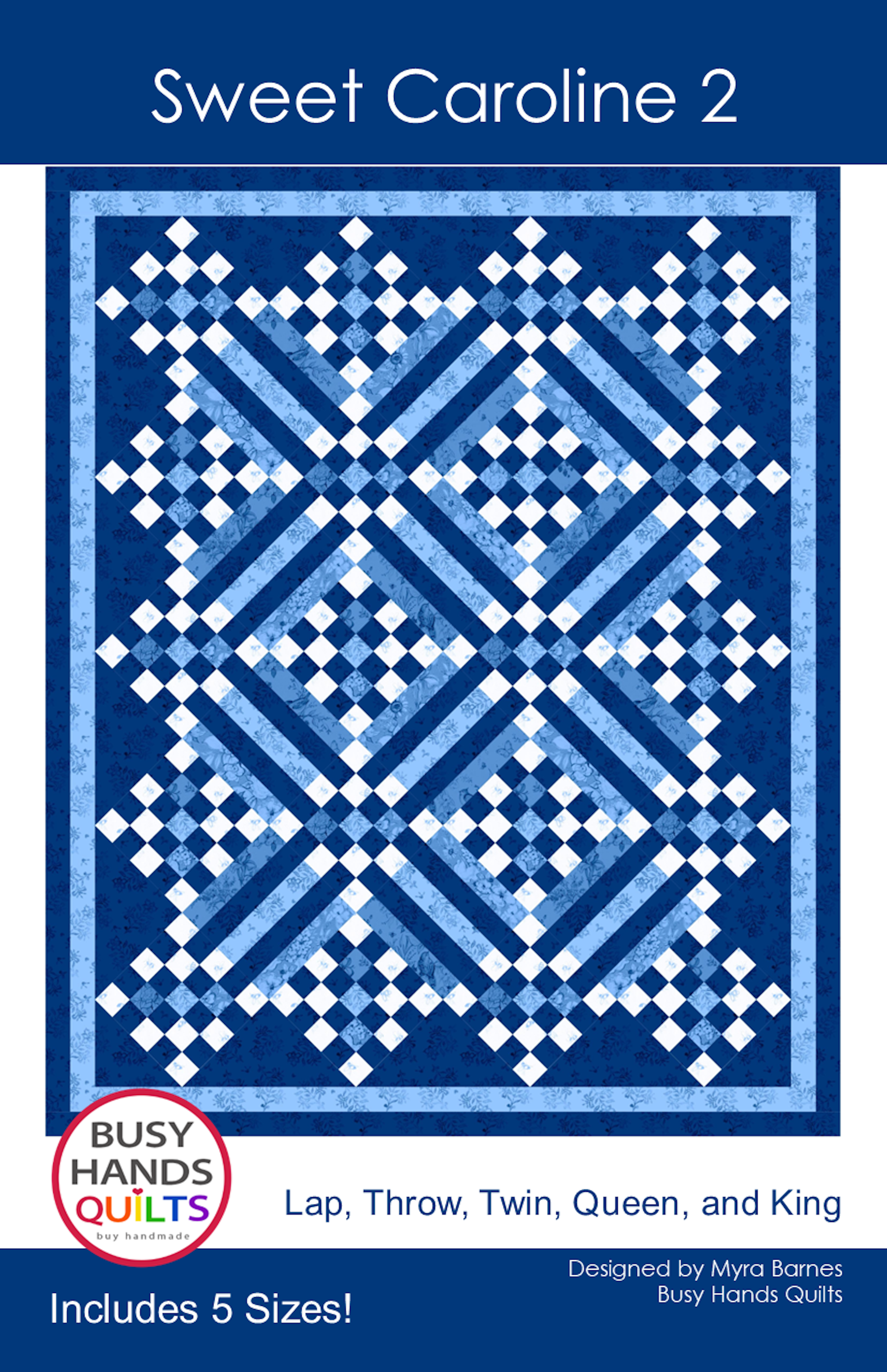 Sweet Caroline II is a striking design made with patchwork and stripe quilt blocks. This is a multi-sized quilt pattern that includes Lap, Throw, Twin, Queen, and King sizes. The Twin size is the Throw size with a wider border added.