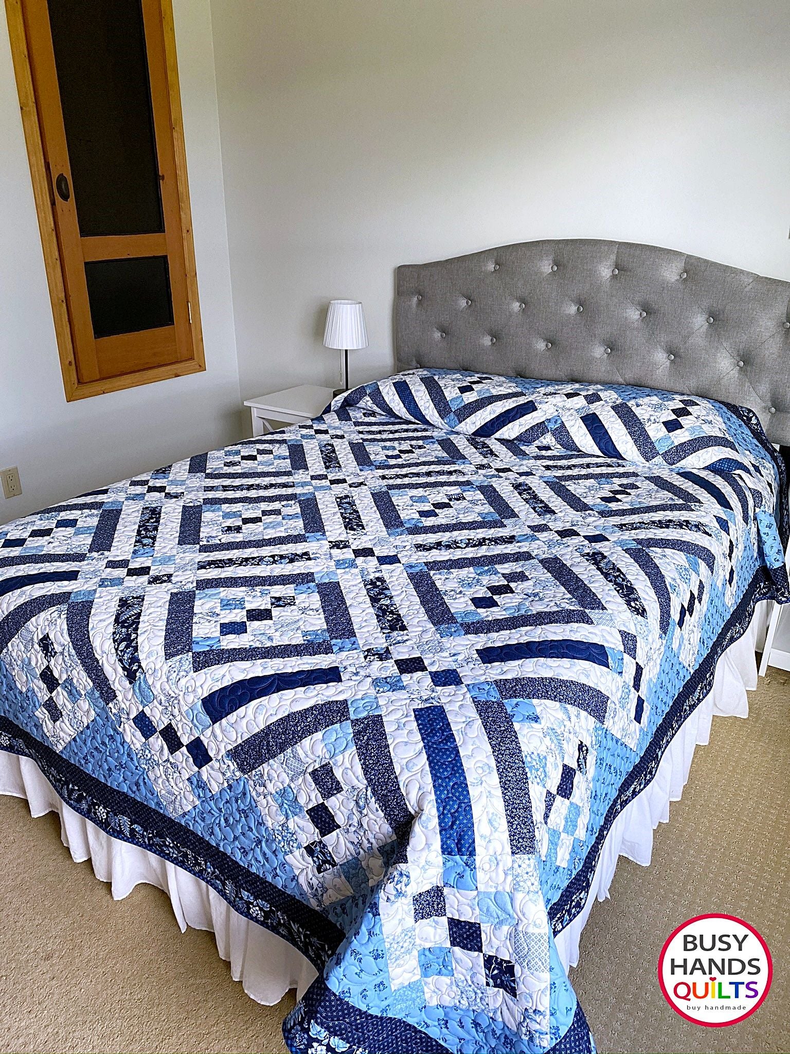 Sweet Caroline is a striking design made with patchwork and stripe quilt blocks. This is a multi-sized quilt pattern that includes Throw, Twin, Queen, and King sizes.