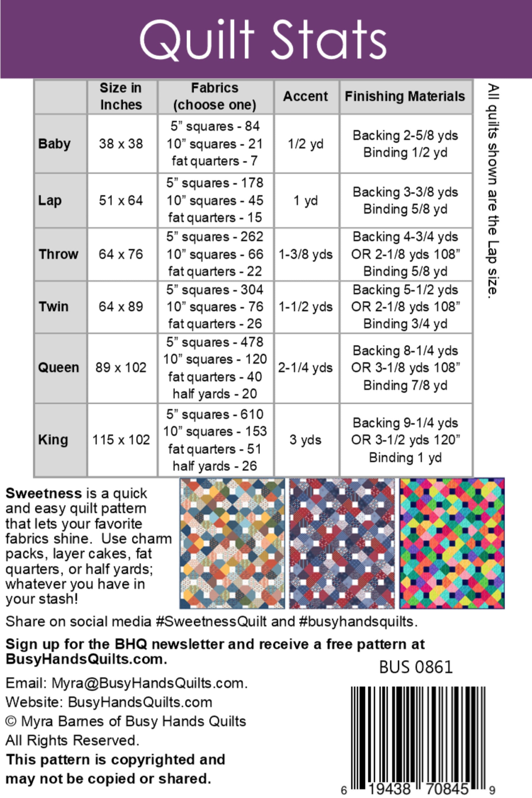 Sweetness is suitable for experienced beginner quilters and up. It has easy-to-follow, step-by-step instructions, charts and diagrams for cutting and piecing this stunning quilt. Previous knowledge of quilt top assembly, basting, quilting, and binding are assumed and are not taught in this pattern.